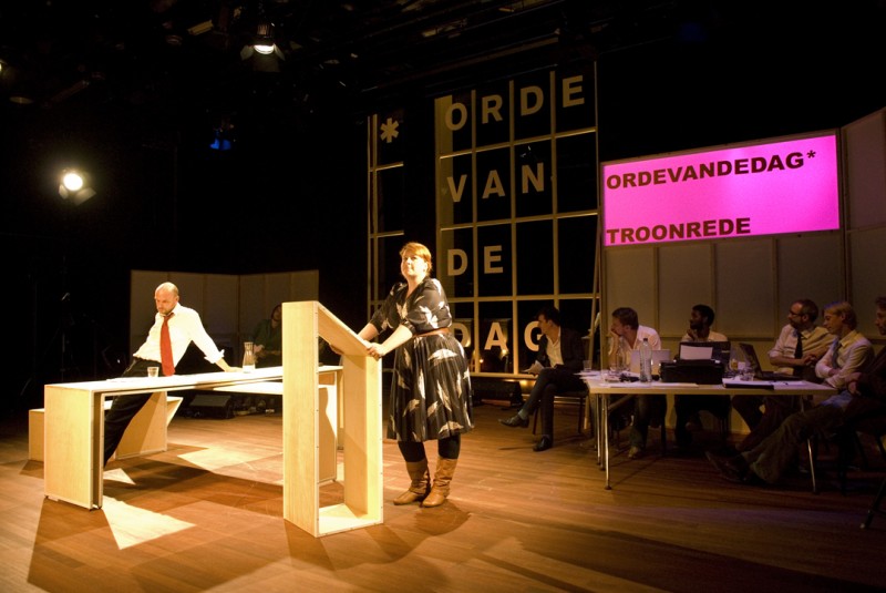 We developed a visual identity, campaign, website and decor for a new and innovative theatre initiative called Orde van de Dag (Order of the Day) founded by Oscar Kocken & Greg Nottrot. This alternating ensemble of upcoming and well-established actors, musicians, writers and directors brings a theatre show in the Stadsschouwburg of Utrecht with a surprising look on the news, constructed largely by the power of improvisation. A critical and satirical tradition is combined with fast and comedic acting, a welcome development for the young and politically aware. Our concept communicates precisely this tickling combination of ‘current’ and ‘in-depth’.